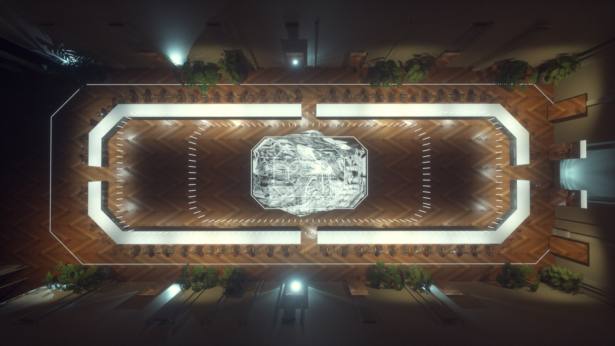 Ma première idée : partir du tracé du plan de l’appartement, qu’on reproduit en néon. Chaque ligne du plan est prolongé dans leur verticalité par des pans de tulles ou l’on projette des visuels. Ces tulles sont enchevêtré pour donner du mouvement et de la légèreté à la structure, créant un contraste entre la géométrie du plan et la fluidité du tissu.